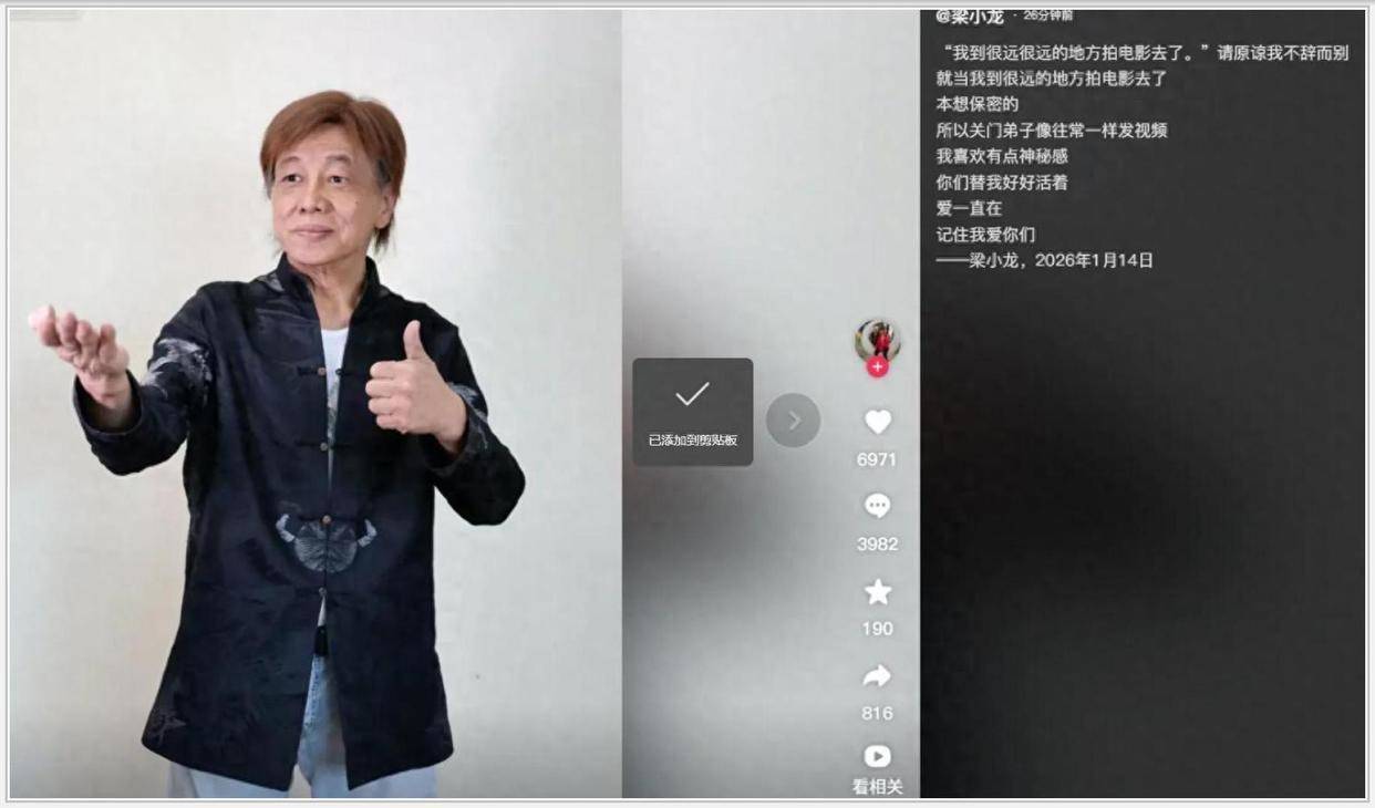 你敢信?1月13日还在深圳火锅店笑得像个老顽童、竖大拇指说“我还行”,隔天1月14日下午 **77岁的梁小龙就因为心脏骤停永远离开了**——陈真没了 火云邪神也真的“去很远的地方拍电影”了!